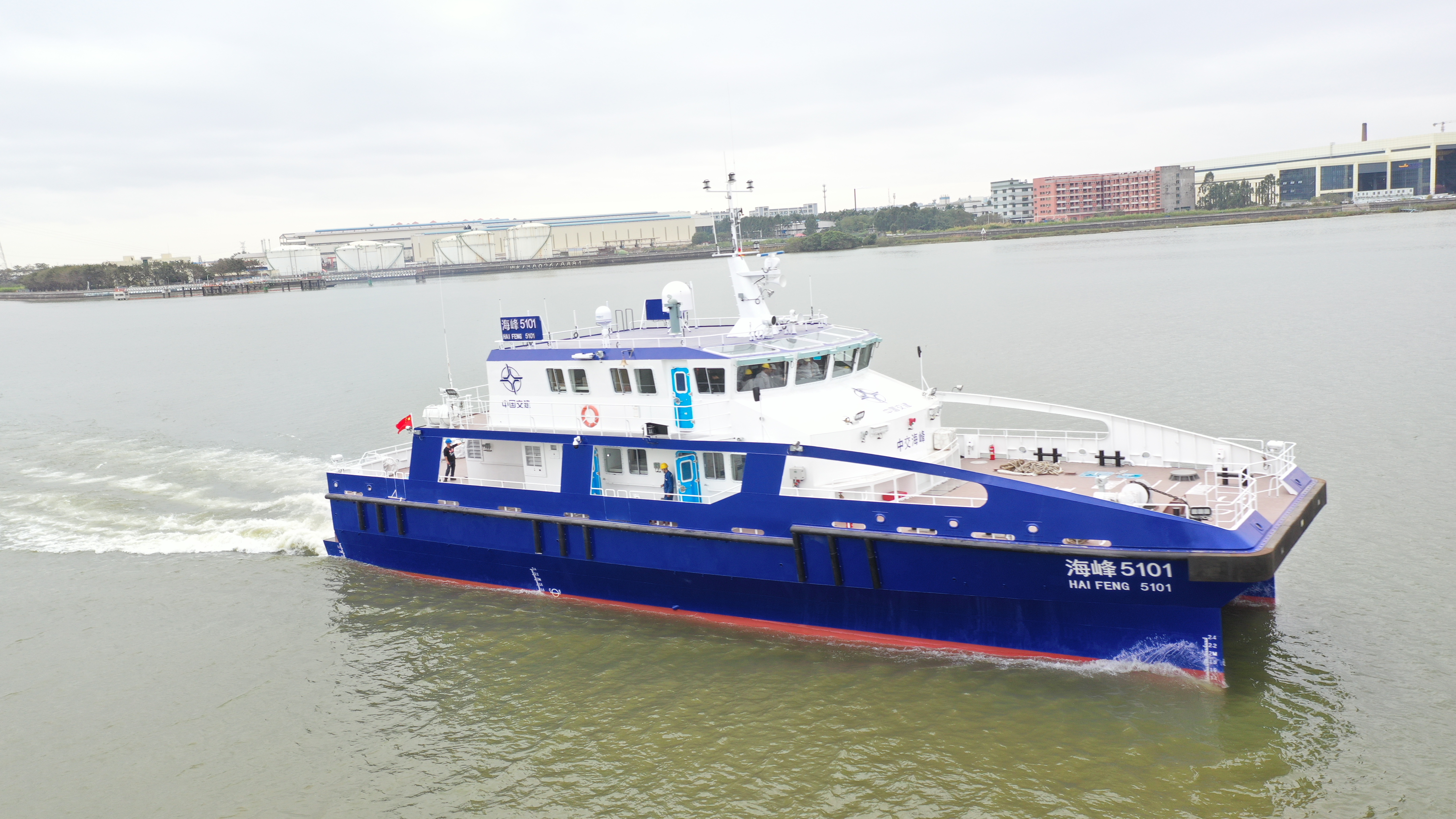 由公司研发投资的海峰5000系列半小水线面型全铝双体高速风电运维船首制船“海峰5101”出色高效地完成搭载国家能源局、广东省政府、阳江市政府及省能源局相关领导到三峡阳西沙扒海上风电场调研海上风电项目建设情况的重要任务,船机性能及舒适度获得领导们的一致好评。
