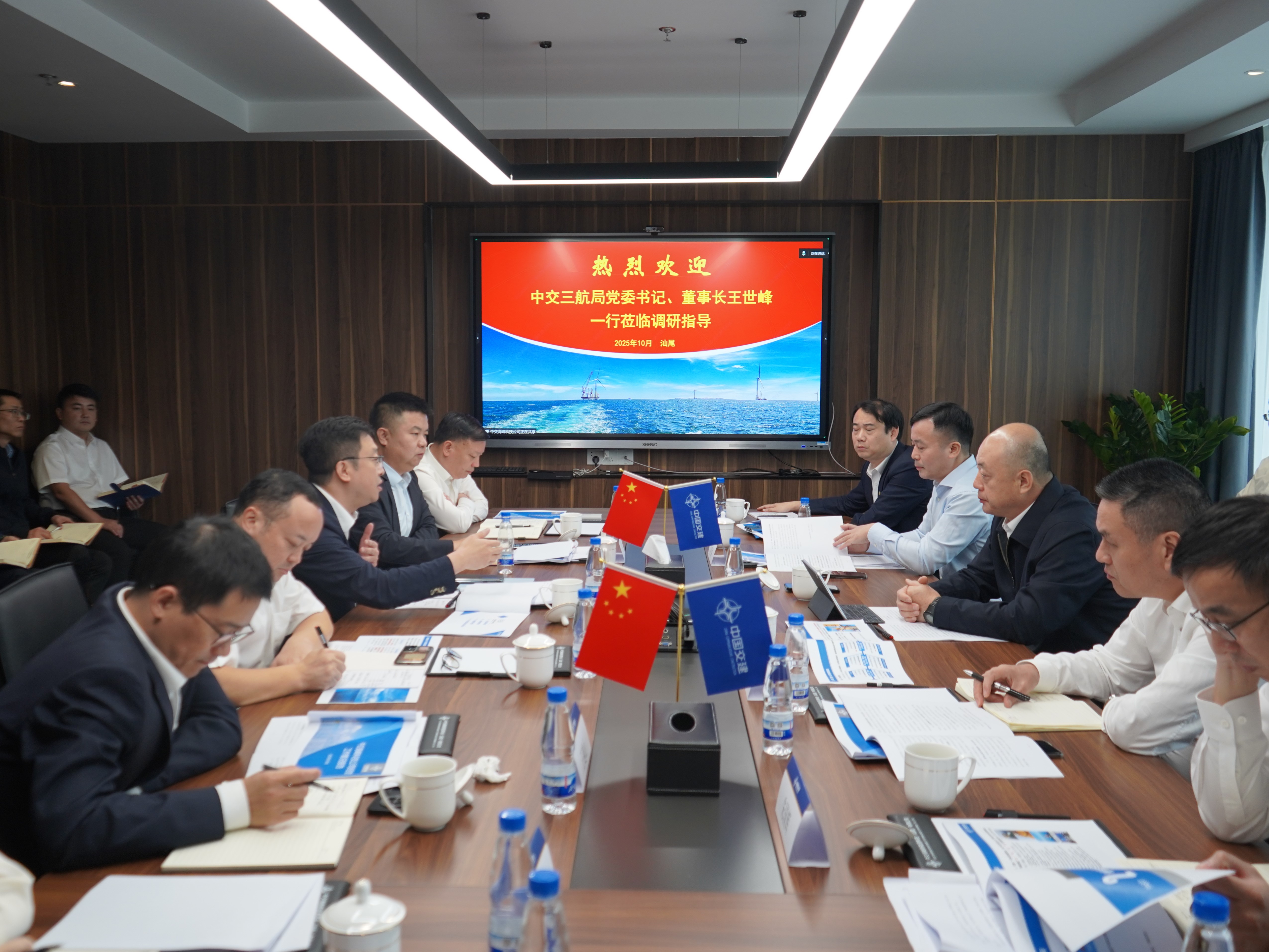 三航局专业总工程师王国平及相关部门负责人;伟德国际1946源于英国总会计师、董事会秘书,总部部门相关负责人及中交海峰科技领导班子成员参加调研。