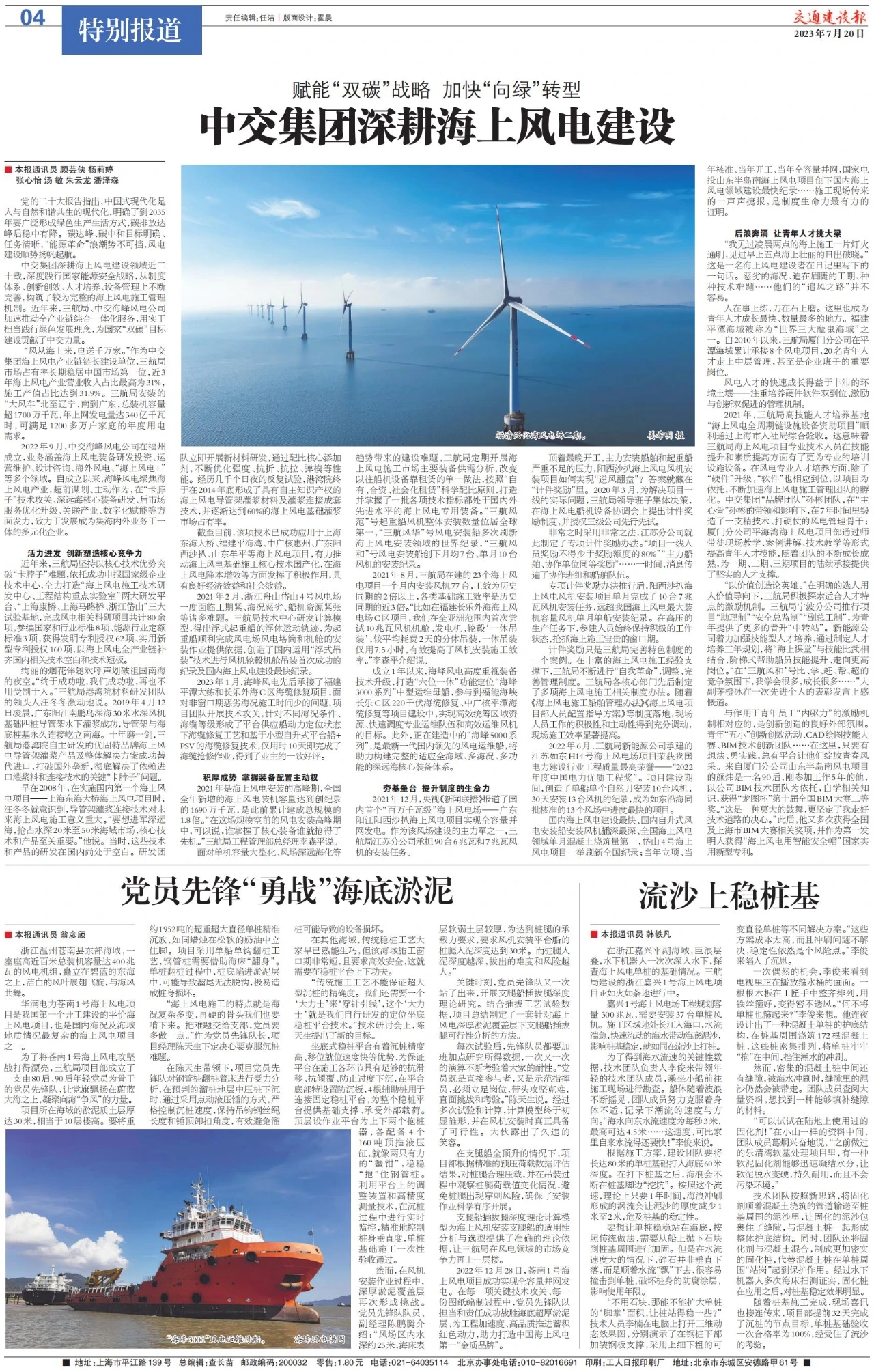 7月20日,最新一期的《交通建设报》专版刊发了《中交集团深耕海上风电建设》等文章和相关照片,充分肯定了公司在中交集团践行国家“双碳”目标战略引领下,积极打造海上风电金质品牌,向“绿”发展以及不断巩固海上风电施工、运维领先者地位的生动实践。