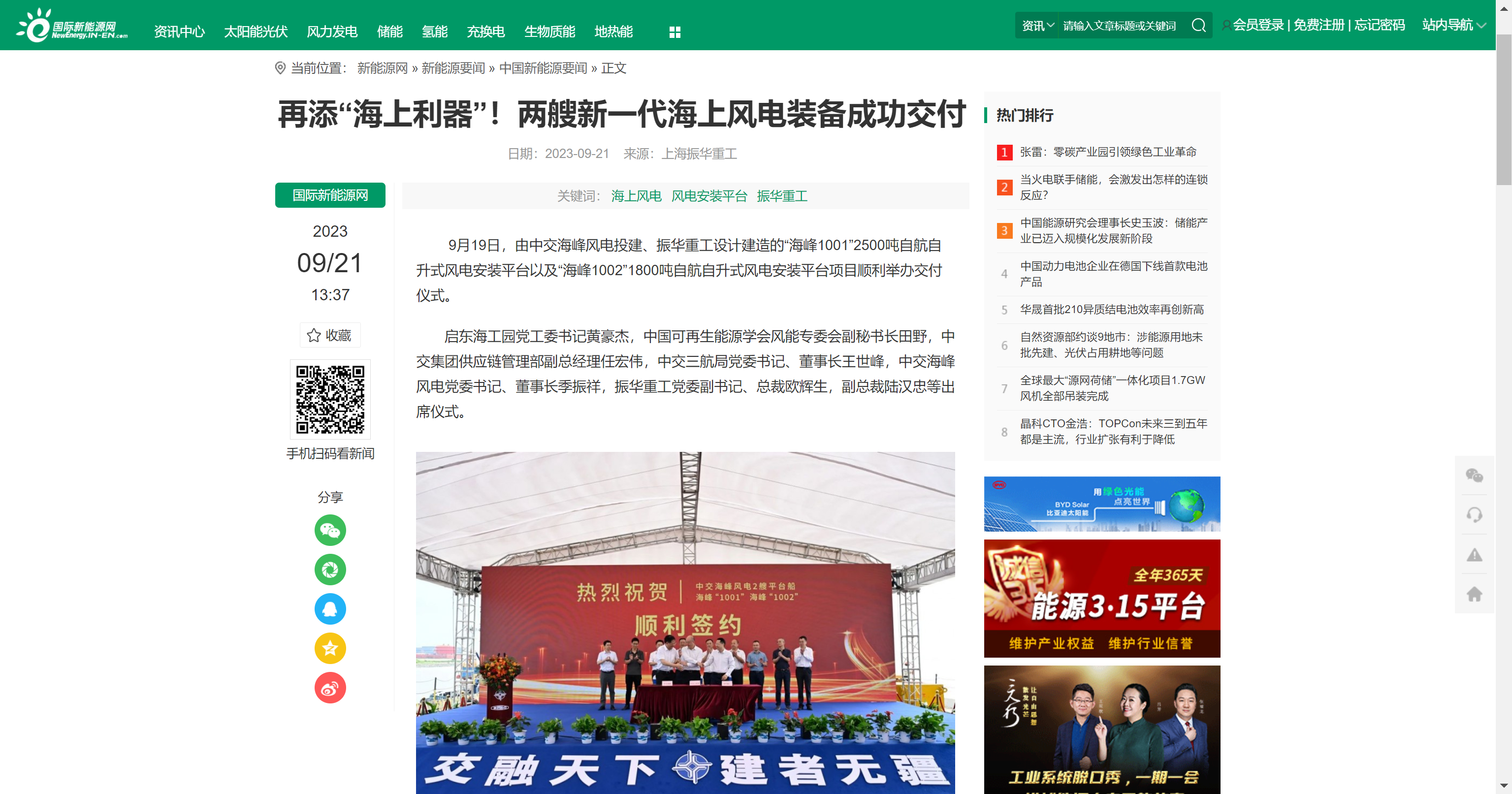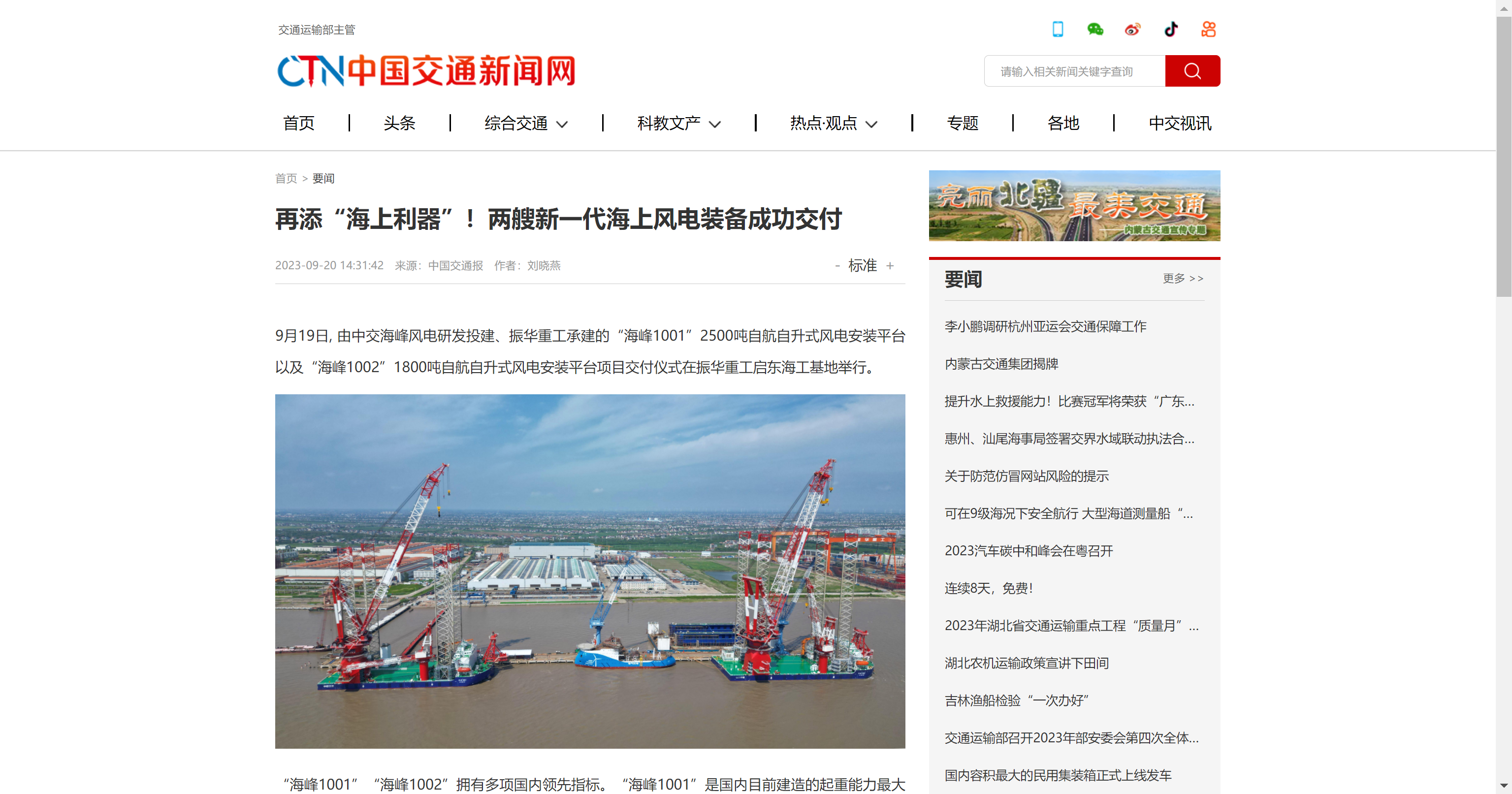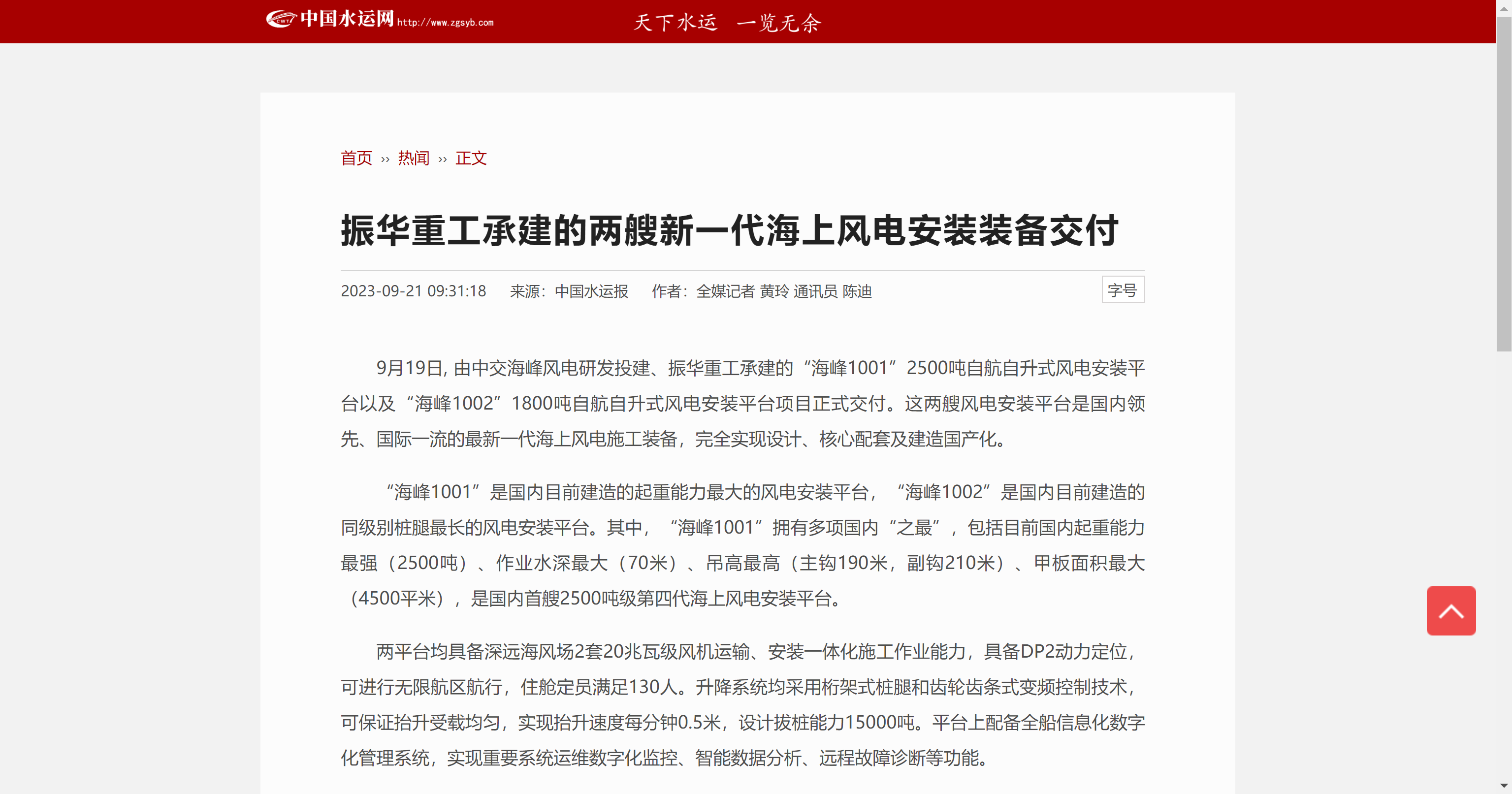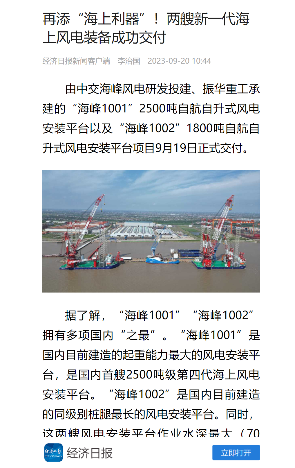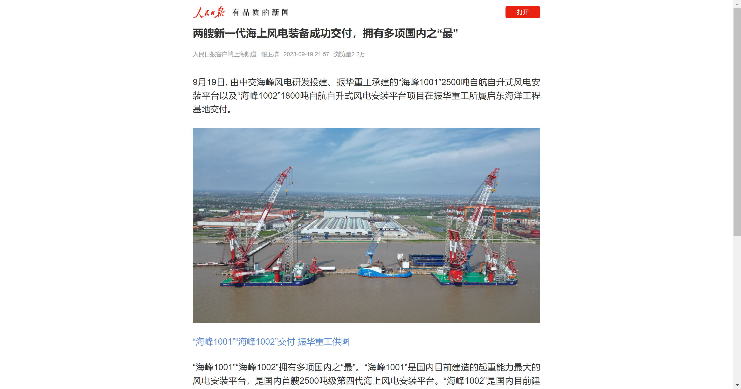 9月19日,公司研发投资的“海峰1001”2500吨自航自升式风电安装平台与“海峰1002”1800吨自航自升式风电安装平台交付仪式与信息发布会圆满举行。有关政府机构、行业协会、企业共20余家单位出席活动。