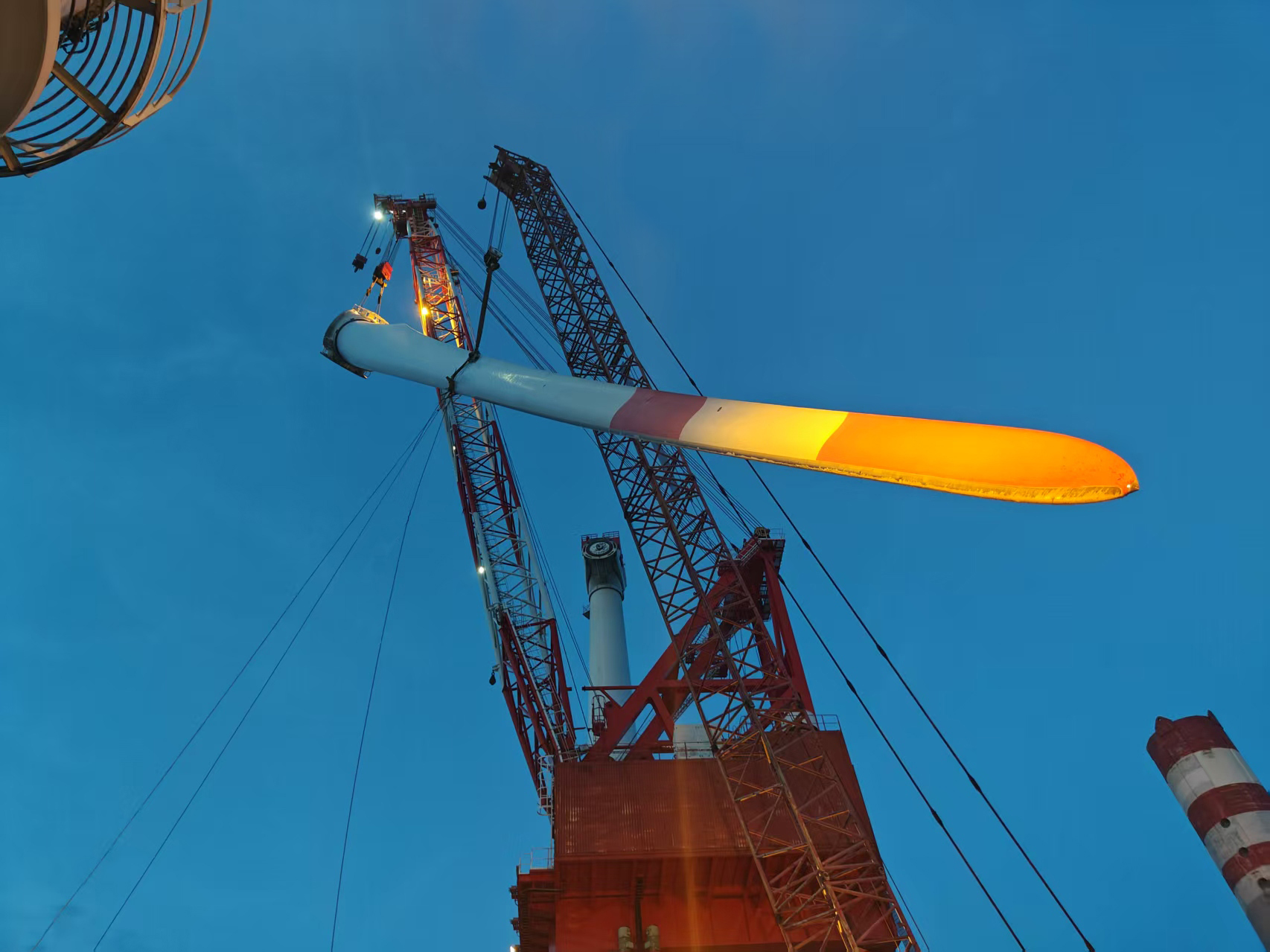 2025年季风季的徐闻海上风电场,115米叶片如同折断的鹰翼悬在百米高空。在风场突发险情与恶劣天气的叠加影响下,叶片夹具运输受阻,无法按时抵达作业现场。项目总工张子侃经过多方案比选,结合实际情况,研究完善出“双机抬吊叶片安装法”。他们通过北斗毫米级定位,抢抓作业间隙,在新工法的加持下,逐步将50余吨庞然大物安全、精准替换。这场与时间的赛跑,最终在接到响应后48小时内高效完成,团队也收到业主“响应有手段、处置有标准”的高度评价。